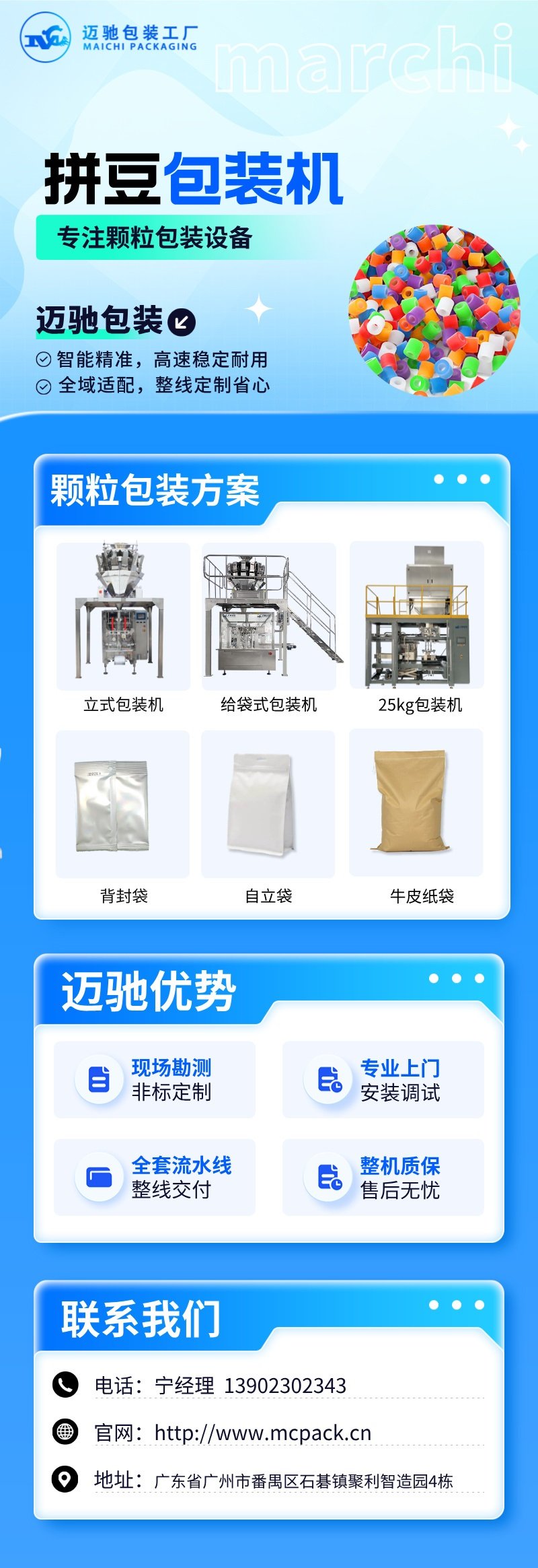 廣州邁馳(chí)包裝設備有限公司專業從事全自動包裝設備的研(yán)發與製造,其MCGD8-200水平給袋式全自動拚豆包裝機憑借穩定可靠的表現,受到眾多客戶的認可。