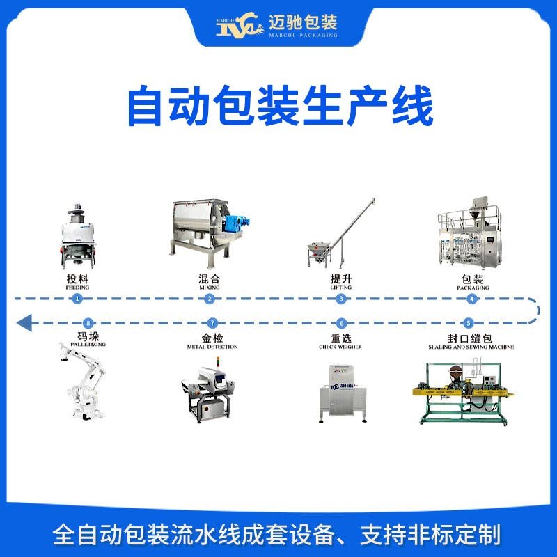 投料→混合→提升→包裝→封口縫包→重選→金檢(jiǎn)→碼垛