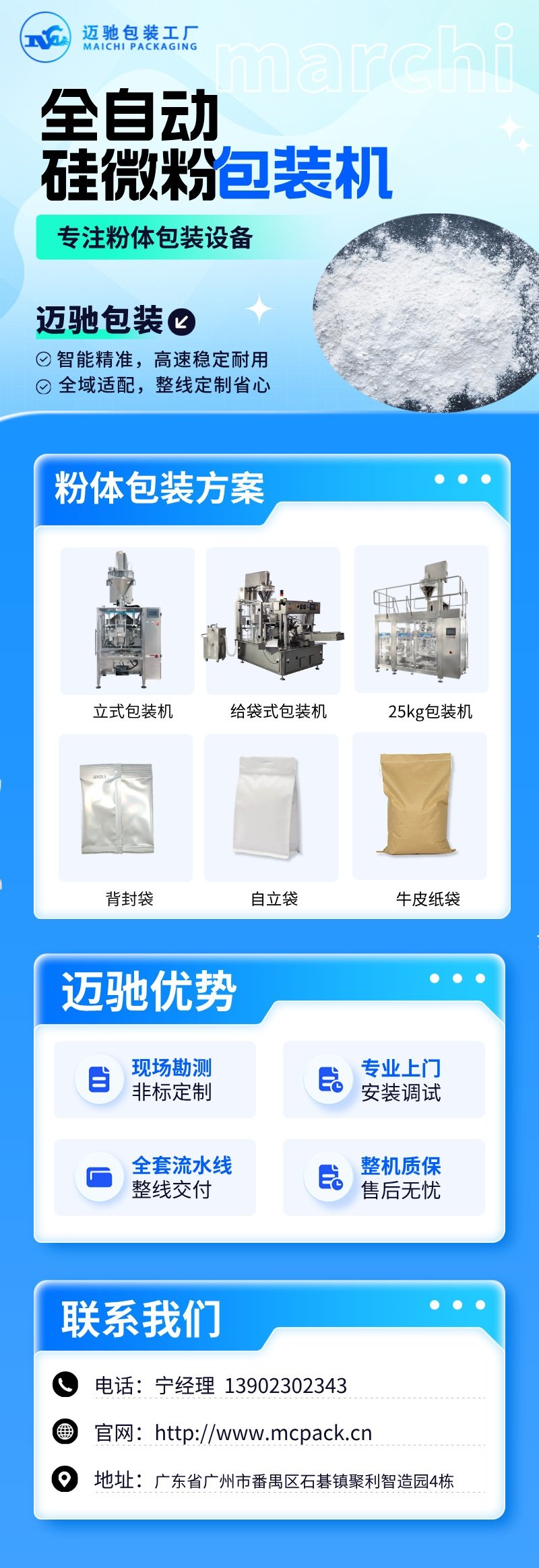 如果您對粉體自動包裝整線有需求,歡迎立即聯係廣(guǎng)州邁馳、合肥邁馳(chí)兩家源廠,製定專屬的矽微粉定製包裝(zhuāng)落地(dì)方案。